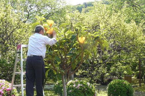 おいしい白びわにするために詳しい方に教わって保護作業を行いました。