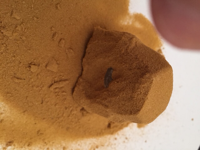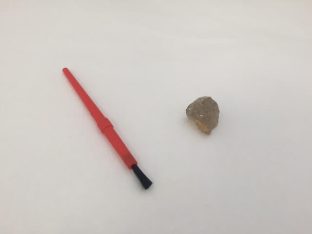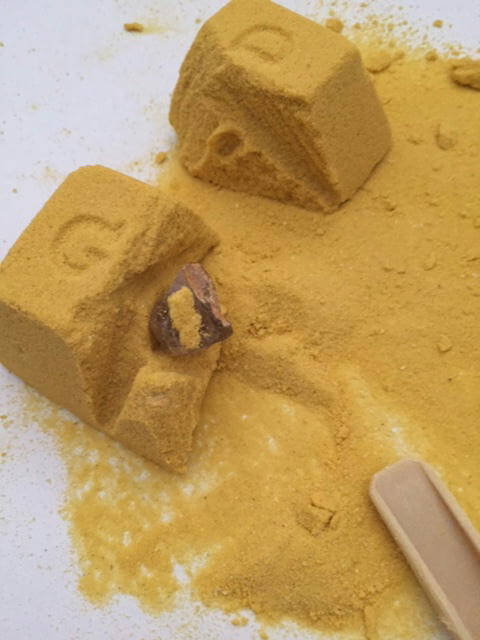 掘ってみるとカチカチで掘れないわけではありませんが、予想していたより砂は固かったです。付属のキットで掘るというより削るようなかんじで砂を減らしていきます。ほどなくして水晶と思われる何かに当たった感触がありました。