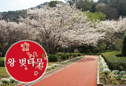 요시노 벚꽃(왕벚나무)뒤로, 매년 3월 하순 무렵에 개화를 시작해, 4월 상순에 만개 됩니다. 야에의 시다레 자쿠라(축 늘어지는 벚꽃나무)는 매우 드물고 봉우리 때는 연분홍 색, 개화되면 백색으로 되고, 지는 무렵에는 다시 분홍색으로 되어 색의 변화를 즐길 수 있습니다. 꽃의 크기는 탁구공 만한 크기에 10~13장의 두꺼운 꽃잎이 늘어진 가지 끝에 20개 정도 밀집된 소프트 볼 정도의 크기로 되어 있습니다. 2002년 4월 8일, (재)일본 꽃 회의 연구원에 의한 신종 시다레 자쿠라(늘어지는 벚꽃)로 인정되었습니다.